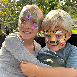 2 Hour Minimum for $250.00 - $75.00 an hour every hour after that. (Generally two hours is all that is needed for a birthday party) With this option you get face paint, glitter and some gems. This option includes a general face paint menu. (Upgrade to Deluxe tier to get a customized menu) This is my basic set up with no frills but classic fun. No additional bling, prizes, customized gifts, costumes or decorated canopy is available with the "Basic" Tier.